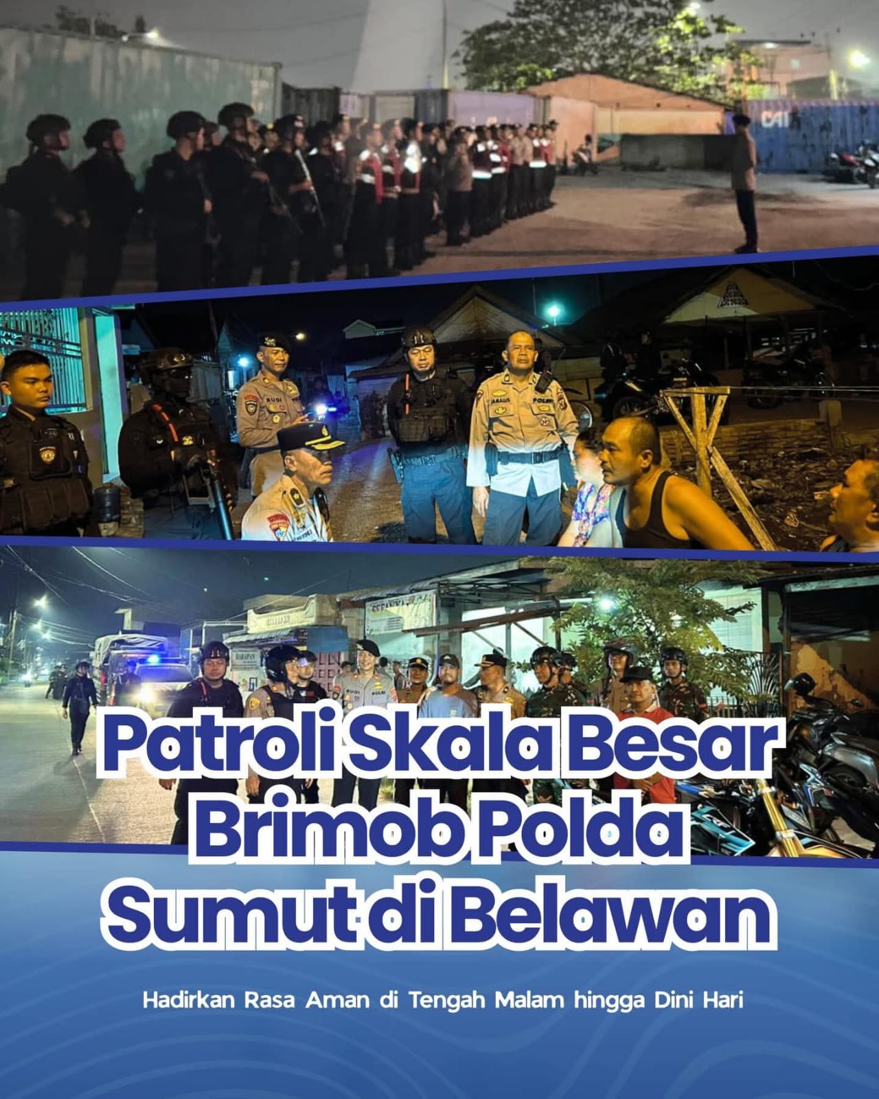 Patroli yang dimulai pukul 22.00 WIB ini dipimpin oleh Danton II Kompi 3 Batalyon A Sat Brimob Polda Sumut, Ipda Agus Gunawan. Petugas menyisir sejumlah titik rawan kriminalitas dan jalur strategis di kawasan Medan Belawan.