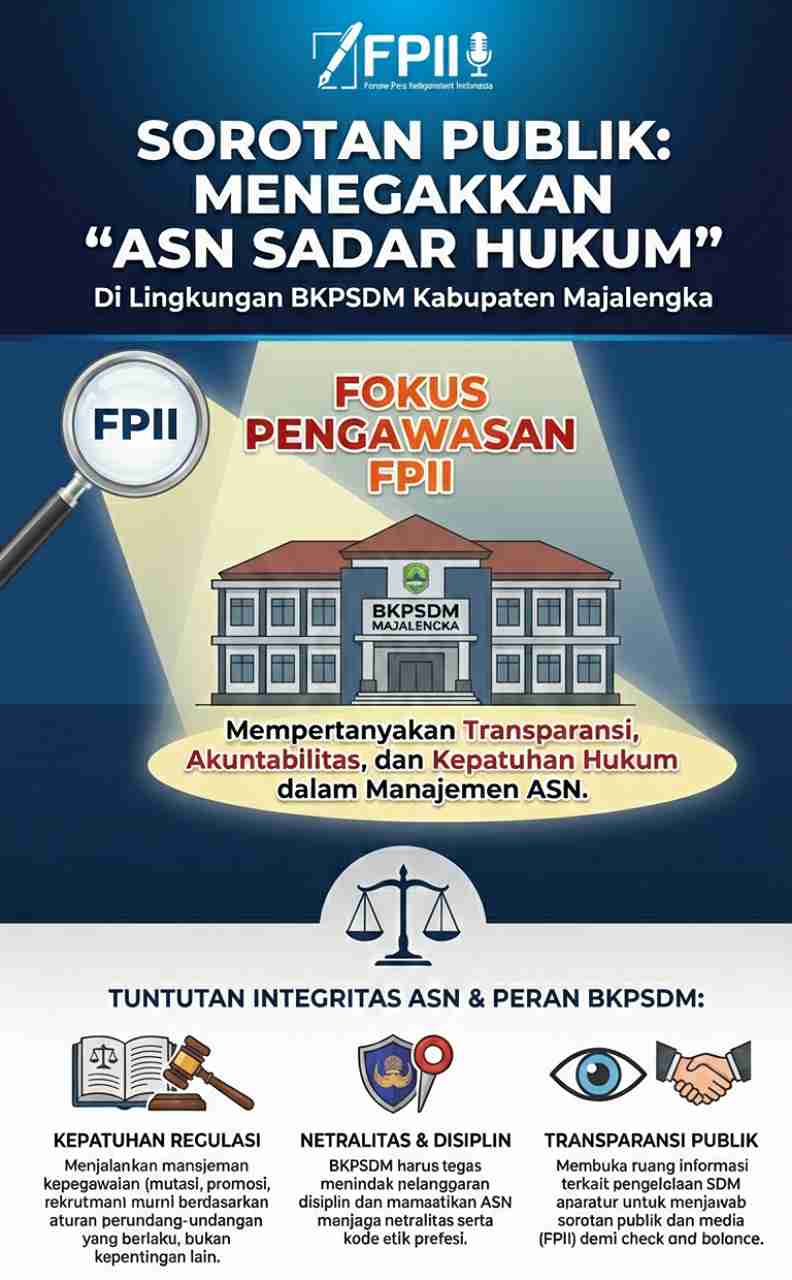 MAJALENGKA, GarisData.com – Forum pers Independensi Indonesia (FPII) Korwil Majalengka mengangkat isu penting terkait loyalitas serta pemahaman hukum bagi aparatur sipil negara (ASN) di lingkungan Pemerintah Kabupaten Majalengka.