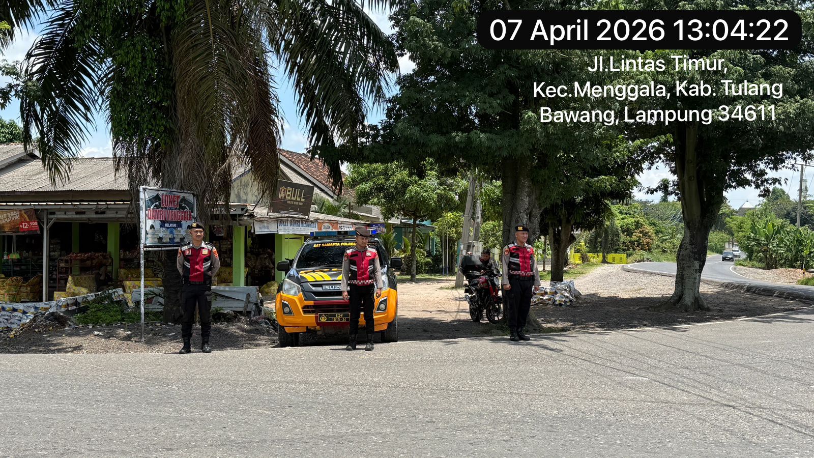 Kegiatan pengamanan yang berjalan penuh disiplin ini dilaksanakan pada hari ini, Selasa, 07 April 2026, mulai pukul 13.00 WIB hingga selesai. Personil gabungan yang dipimpin langsung oleh Aiptu Jon Heriyanto beserta tim, menyusuri titik-titik vital di wilayah hukum Polsek Menggala, meliputi Jalan Raya Gunung Sakti dan Jalan Lintas Timur Kecamatan Menggala.