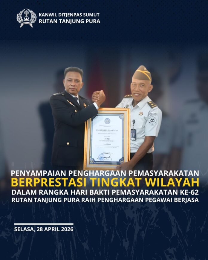 GARISDATA.COM, TANJUNG PURA – Rumah Tahanan Negara (Rutan) Kelas IIB Tanjung Pura menorehkan prestasi gemilang di momen Hari Bakti Pemasyarakatan (HBP) ke-62. Rutan Tanjung Pura berhasil meraih penghargaan kategori Pegawai Berjasa Tingkat Wilayah yang diselenggarakan oleh Kantor Wilayah Kementerian Hukum dan HAM Sumatera Utara.