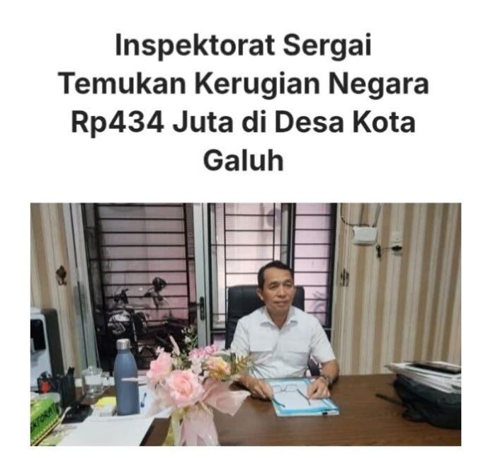 Garisdata.com | Serdang Bedagai – Inspektorat Kabupaten Serdang Bedagai (Sergai) menemukan kerugian negara sebesar Rp434 juta dalam pengelolaan Dana Desa (DD) di Desa Kota Galuh, Kecamatan Perbaungan. Atas temuan tersebut, Kepala Desa Kota Galuh, Bima Suryajaya, resmi dijatuhi Tuntutan Ganti Rugi (TGR).