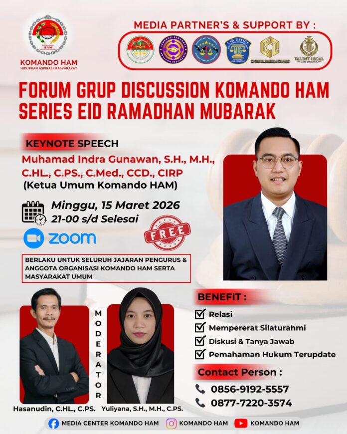 Banten,garisdata.com– Komando HAM akan mengadakan Forum Group Discussion (FGD) Series Eid Ramadhan Mubarak dengan tema “Mewujudkan Keadilan Hukum di Era Digital”. Acara ini akan berlangsung pada Minggu, 15 Maret 2026, pukul 21.00 WIB via Zoom Meeting.