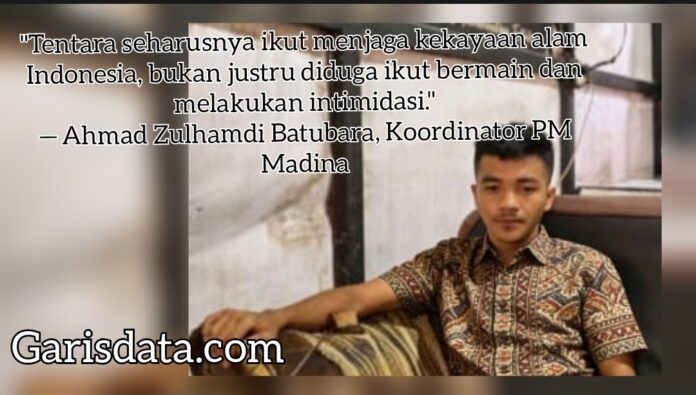 Mandailing Natal– Persatuan Mahasiswa Madina (PMM) mendesak Polisi Militer Kodam (Pomdam) I/Bukit Barisan proaktif menyelidiki dugaan keterlibatan oknum anggota TNI yang menyokong (back up) aktivitas pertambangan ilegal di Kabupaten Mandailing Natal, Sumatra Utara.