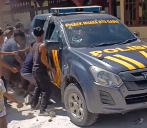 Tidak hanya gedung mapolsek, massa juga merusak dan membakar satu unit mobil patroli. Kendaraan dinas itu digulingkan, disiram bensin, lalu dibakar hingga hangus.