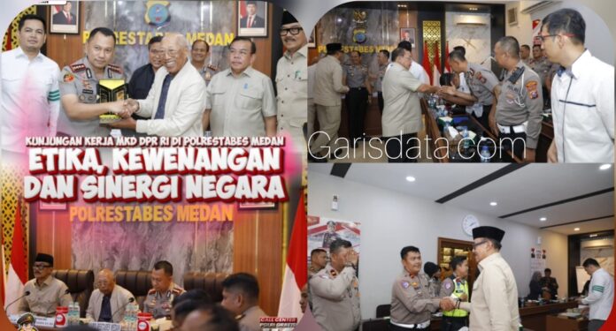 Garisdata.com: MEDAN, – Mahkamah Kehormatan Dewan (MKD) DPR RI melaksanakan kunjungan kerja ke Polrestabes Medan dalam rangka sosialisasi tugas, fungsi, dan wewenang MKD serta penggunaan TNKB khusus bagi pimpinan dan anggota DPR RI, bertempat di Aula Rupatama Polrestabes Medan, Rabu (15/04/26). Kegiatan ini disambut langsung oleh Kapolrestabes Medan Kombes Pol Dr. Jean Calvijn Simanjuntak, S.I.K., M.H. bersama jajaran.