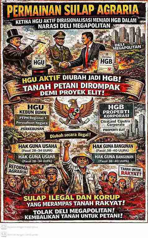 MEDAN,Garisdata.com – Pertanahan Indonesia kian menyerupai panggung Ilusionisme: di atas teks undang-undang, prosedur tampak tertib dan rasional, tetapi di lapangan publik menyaksikan ‘akrobat administratif’ ketika HGU yang masih aktif seolah bermetamorfosis menjadi HGB demi proyek bertajuk Deli Megapolitan—sebuah transformasi yang di poles dengan bahasa legal-formal, padahal rasio legisnya keropos dan partisipasi publiknya minim.