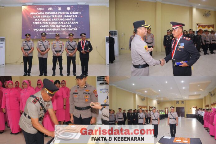 Mandailing Natal | Garisdata.com – Kepolisian Resor (Polres) Mandailing Natal menggelar upacara Wisuda Purna Bakti, serah terima jabatan (sertijab), serta penyerahan jabatan di Aula Pesat Gatra Polres Madina, Rabu (22/4/2026) pagi. Kegiatan ini menjadi bagian dari pembinaan organisasi sekaligus bentuk penghargaan atas pengabdian personel Polri.