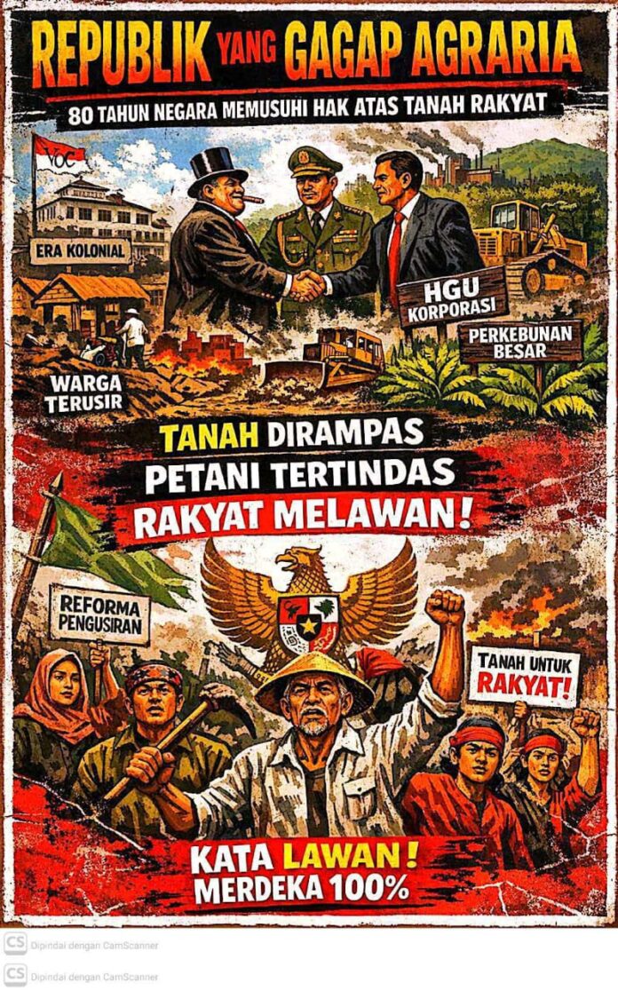 Garisdata.com l Medan, Sumut —- Delapan puluh tahun republik ini berdiri, tetapi soal tanah kita masih seperti bangsa yang baru belajar merdeka. Di satu sisi, konstitusi melalui Pasal 33 ayat (3) UUD 1945 menegaskan bahwa bumi, air, dan kekayaan alam dikuasai oleh negara untuk sebesar-besar kemakmuran rakyat.