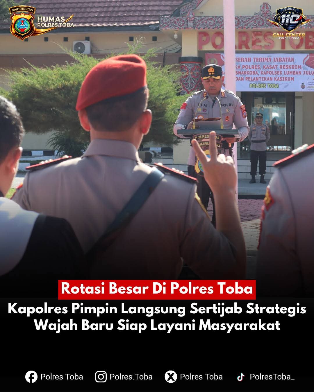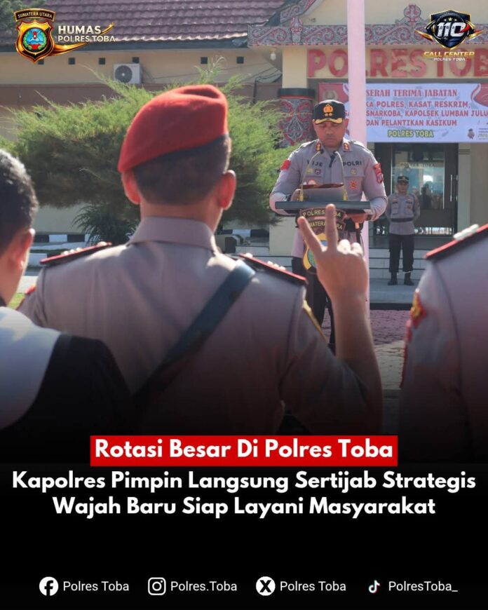 Garisdata.com: TOBA – Ada yang berbeda di tubuh Polres Toba, Kapolres Toba AKBP V.J. Parapaga, S.I.K memimpin langsung serah terima jabatan (Sertijab) sejumlah posisi strategis: Wakapolres, Kasat Reskrim, Kasat Narkoba, Kapolsek Lumban Julu hingga pelantikan Kasikum , Kamis (16/06/26).