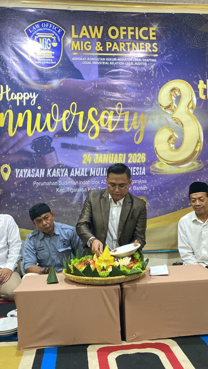 Banten, Garisdata.Com – Law Office Mig & Partner’s (Lawofficemig) memperingati hari jadinya yang ke-3 tahun dengan penuh rasa syukur dan semangat kebersamaan. Momentum ini menjadi refleksi perjalanan serta komitmen kantor hukum dalam memperjuangkan penegakan hukum yang berkeadilan dan berpihak kepada masyarakat.