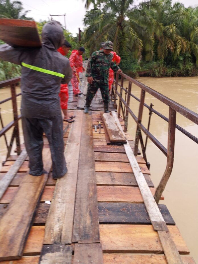 Garisdata.com | Mandailing Natal 10/12/2025 Jembatan gantung (rambin) penghubung antar desa pada Kamis 20 November 2025 di lakukan perbaikan secara gotong royong berkolaborasi dengan pihak perusahaan Perkebunan Pt. Palmaris Raya Batahan.